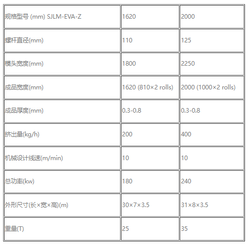 本生产线采用流延工艺, 以VA含量为30%~33%的EVA树脂为主要原料,生产EVA太阳能电池封装胶膜。经改变配方和工艺,也可生产玻璃用EVA夹层热熔胶膜。